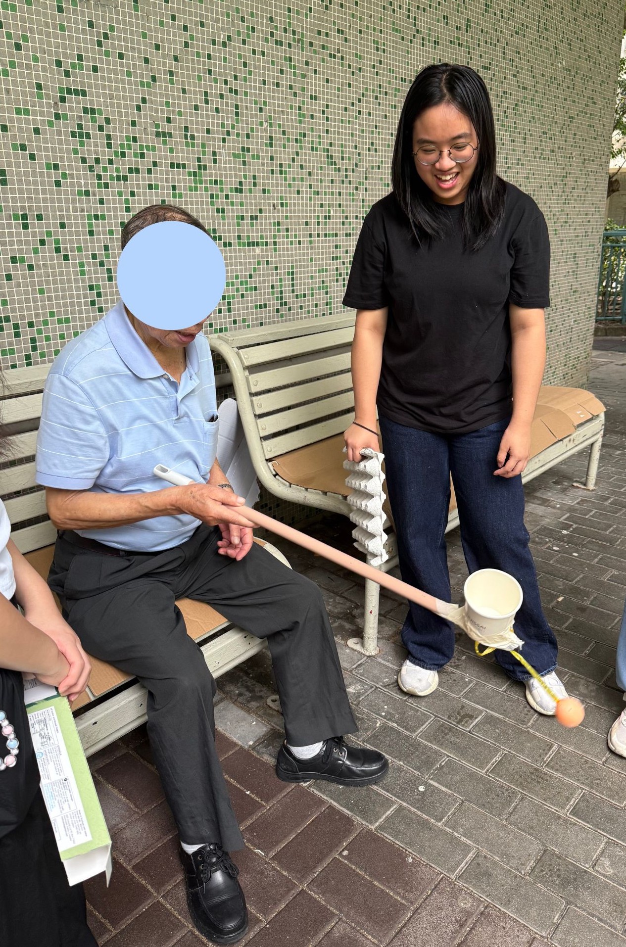於是我們透過不同的小遊戲,來作為介入點與長者互動。當我們在嘗試使用一些簡約、熟悉的日常用品來製作小遊戲後,發現他們會認爲這些不是一些營銷手段,或不會擔心損壞的情况,故此接受程度相較於傳統運動來説會較高,並更創新。